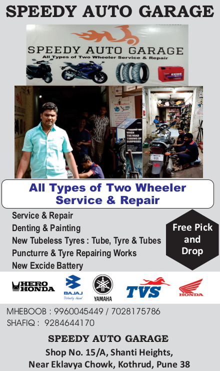 | All Types of Two Wheeler Service & Repair. Service & Repair, Denting & Painting, New Tubeless Tyres : Tube, Tyre & Tubes, Puncture & Tyre Repairing Works, New Excide Battery, Free Pick and Drop. Mobile: 7028175786 / 9284644170 |