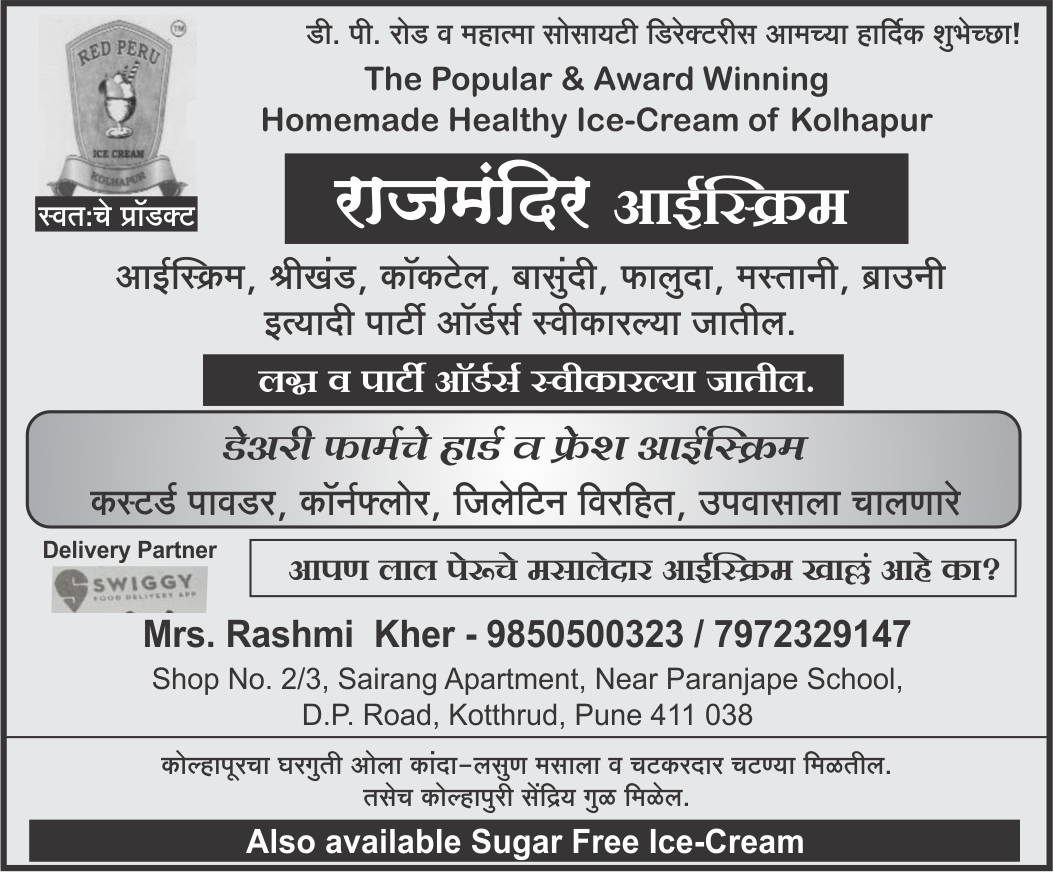 Icecream, Srikand, Cocktail, Basundi, Faluda, Mastani, Brownie, etc. We accept party orders. Mobile: 7972329147 |