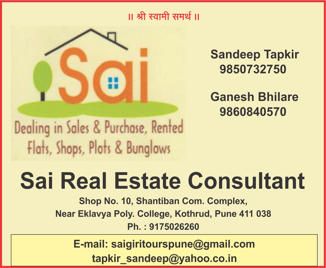 | Dealing in Sales & Purchase, Rented Flats, Plots & Bunglows. Mobile: 9850732750 / 9175026260 |