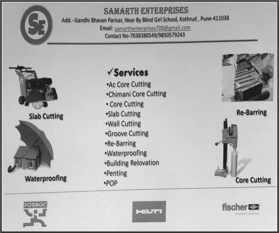 Services: Ac core cutting, Chimani core cutting, Core cutting, Slab cutting, Wall cutting, Groove cutting, Re-Barring, Waterproofing, Building Relovation, Penting, POP. |